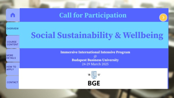 24-25 March 2025 ESG business case Budapest Business University 26-27 March 2025 Well-being and lifestyle studies Budapest Business University 28 March 2025 Discovering Budapest