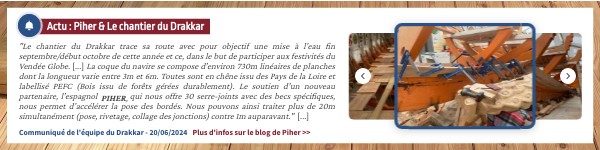 "Le chantier du Drakkar trace sa route avec pour objectif une mise à l’eau fin septembre/début octobre de cette année et ce, dans le but de participer aux festivités du Vendée Globe. [...] La coque du navire se compose d’environ 730m linéaires de planches dont la longueur varie entre 3m et 6m. Toutes sont en chêne issu des Pays de la Loire et labellisé PEFC (Bois issu de forêts gérées durablement). Le soutien d’un nouveau partenaire, l’espagnol PIHER, qui nous offre 30 serre-joints avec des becs spécifiques, nous permet d’accélérer la pose des bordés. Nous pouvons ainsi traiter plus de 20m simultanément (pose, rivetage, collage des jonctions) contre 1m auparavant." [...]