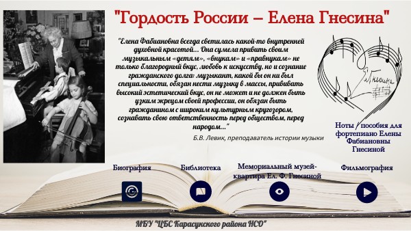 Интерактивный плакат создан и посвящен Елене Фабиановне Гнесиной легендарной личности в истории отечественной культуры, создателя крупнейшего комплекса музыкального образования.