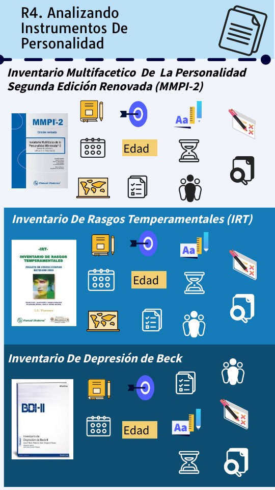 Es un test de amplio espectro diseñado para evaluar un gran número de patrones de personalidad.y trastornos emocionales. La prueba proporciona evaluaciones objetivas y perfiles determinados a partir de barremos nacionales. La prueba Finalidad: evaluación de varios factores o aspectos de la personalidada través de tres gruposde escalas: básicos, de contenido y suplementarias. El MMPI-2 es uno de los instrumentos más importantesy utilizados en la evaluación de psicopatología en adultos, en los contextos clinicos, médicos, forenses y de selección de personal.“(...) el MMPI-2 no está diseñado para dirigirse a todas las características o conductas (...) Por ejemplo, la prueba no atiende a cualidades o estados como la inteligencia, la presencia de trastorno cerebral orgánico o la probabilidad de cometer un actoviolento” (Butcher, 1999 citado en Butcher et al 2019).