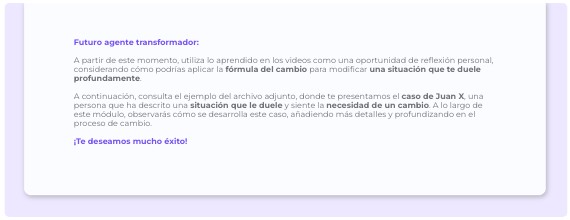 Futuro agente transformador: A partir de este momento, utiliza lo aprendido en los videos como una oportunidad de reflexión personal, considerando cómo podrías aplicar la fórmula del cambio para modificar una situación que te duele profundamente. A continuación, consulta el ejemplo del archivo adjunto, donde te presentamos el caso de Juan X, una persona que ha descrito una situación que le duele y siente la necesidad de un cambio. A lo largo de este módulo, observarás cómo se desarrolla este caso, añadiendo más detalles y profundizando en el proceso de cambio. ¡Te deseamos mucho éxito!