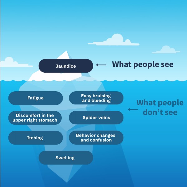 Yellowing of the skin and eyes (jaundice) may occur in more severe cases of MASH when there is cirrhosis (severe scarring) of the liver. Jaundice is a sign of serious liver damage.