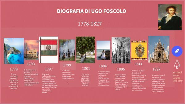 Né più mai toccherò le sacre sponde Ove il mio corpo fanciulletto giacque, Zacinto mia, che te specchi nell’onde Del greco mar, da cui vergine nacque Venere, e fea quelle isole feconde Col suo primo sorriso, onde non tacque Le tue limpide nubi e le tue fronde L’inclito verso di colui che l’acque Cantò fatali, ed il diverso esiglio Per cui bello di fama e di sventura Baciò la sua petrosa Itaca Ulisse. Tu non altro che il canto avrai del figlio, O materna mia terra; a noi prescrisse Il fato illacrimata sepoltura.