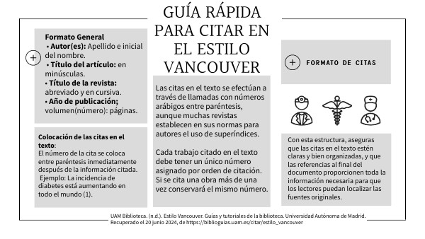 UAM Biblioteca. (n.d.). Estilo Vancouver. Guías y tutoriales de la biblioteca. Universidad Autónoma de Madrid. Recuperado el 20 junio 2024, de https://biblioguias.uam.es/citar/estilo_vancouver