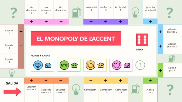 -El joc es pot dur a terme per grups o de manera individual. -L'objectiu del joc és aprendre o reforçar la teoria de l'accentuació mentre juguen. L'objectiu del joc, com en el Monopoly normal, és aconseguir totes les targetes de colors. -Cada cop que es premi el dau la persona o grup corresponent mourà una de les fitxes del mig del taulell el nombre de caselles que digui el dau. Es desplegarà la pregunta o activitat i l'hauran de respondre. Si l'encerten, es quedaran una petita cartolina del mateix color amb el títol de l'activitat. -Cada cop que caiguin en el símbol de pregunta, podran demanar un dubte al mestre/a. -Cada cop que caiguin en una gasolinera, podran consultar un dubte al diccionari. -Cada cop que caiguin en una bombeta, podran consultar el corrector de Softcatalà. .