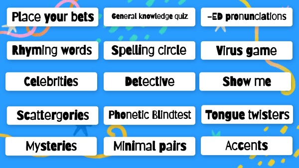 This game is played in a circle. The first player chooses a category "I know 5... Colors!"Players pass the clap by naming an item "red", "blue", "white", "yellow", "green" The last word in this chain should be spelt letter by letter with one letter for one clap: "green": g (clap) - r (clap) - e (clap) - e (clap) - n (clap) The last player shouldn't let the previous student touch his or her hand. If the last student is fast enough and the previous person can't touch his hand, he is the winner. And you can start playing the game with a new category like school subjects, days of the week, etc 😊