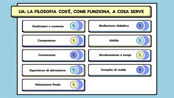 Il presente lavoro è pensato come prima lezione di filosofia di un Terzo liceo scientifico, composto da 22 studenti (14 ragazze, 8 ragazzi). Il periodo dell'azione didattica è metà settembre. Il docente ha cura di far disporre, dopo le presentazioni iniziali, le sedie-banchi a cerchio durante la fase iniziale di brainstorming. Il docente stesso si siederà tra gli studenti per condurre il dialogo iniziale. Nella fase di visione dei materiali multimediali-stimolo, gli studenti si rivolgeranno in direzione del pannello multimediale (mentre il docente osserverà in modo alterno lo schermo e la classe).