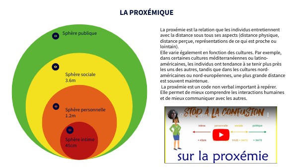 La proxémie est la relation que les individus entretiennent avec la distance sous tous ses aspects (distance physique, distance perçue, représentations de ce qui est proche ou lointain). Elle varie également en fonction des cultures. Par exemple, dans certaines cultures méditerranéennes ou latino-américaines, les individus ont tendance à se tenir plus près les uns des autres, tandis que dans les cultures nord-américaines ou nord-européennes, une plus grande distance est souvent maintenue. La proxémie est un code non verbal important à repérer. Elle permet de mieux comprendre les interactions humaines et de mieux communiquer avec les autres.