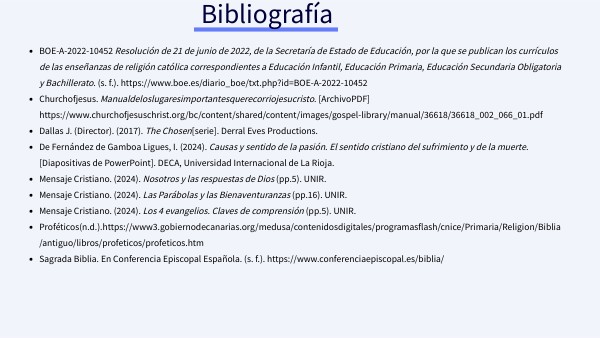 - De Fernández de Gamboa Ligues, I. (2024). Causas y sentido de la pasión. El sentido cristiano del sufrimiento y de la muerte. [Diapositivas de PowerPoint]. DECA, Universidad Internacional de La Rioja.