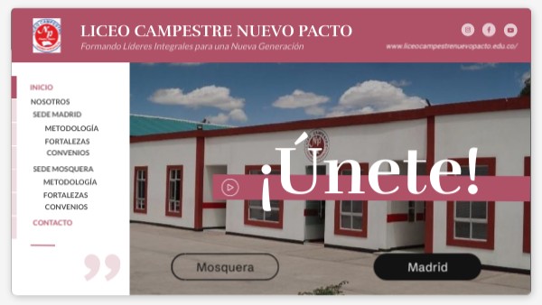 El Liceo Campestre Nuevo Pacto fue fundado en el año 2009 en Mosquera, teniendo como objetivo la formación de Líderes Integrales, dando la mejor educación de calidad soportada en sólidos principios y valores cristianos.En el año 2024 nos ampliamos a la sede Madrid - Puente Piedra, para llevar nuestro modelo a más familias, sin descuidar nuestra sede Mosquera.Nuestro colegio cuenta con grupos pequeños que garantizan una atención personalizada gracias a la cual somos verdaderamente una familia, donde tenemos una relación especial con cada estudiante.