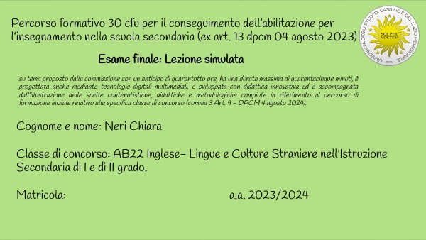 Cognome e nome: Neri Chiara Classe di concorso: AB22 Inglese- Lingue e Culture Straniere nell'Istruzione Secondaria di I e di II grado. Matricola: a.a. 2023/2024