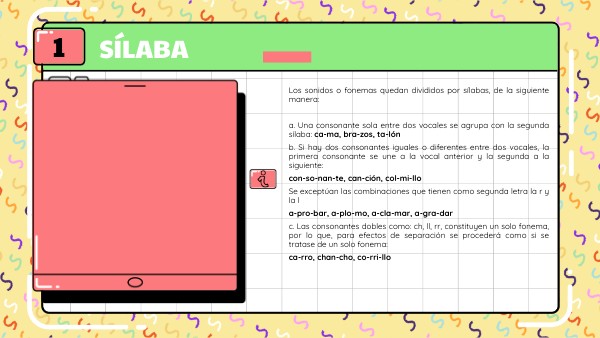 Los sonidos o fonemas quedan divididos por sílabas, de la siguiente manera: a. Una consonante sola entre dos vocales se agrupa con la segunda sílaba: ca-ma, bra-zos, ta-lón b. Si hay dos consonantes iguales o diferentes entre dos vocales, la primera consonante se une a la vocal anterior y la segunda a la siguiente: con-so-nan-te, can-ción, col-mi-llo Se exceptúan las combinaciones que tienen como segunda letra la r y la l a-pro-bar, a-plo-mo, a-cla-mar, a-gra-dar c. Las consonantes dobles como: ch, ll, rr, constituyen un solo fonema, por lo que, para efectos de separación se procederá como si se tratase de un solo fonema: ca-rro, chan-cho, co-rri-llo