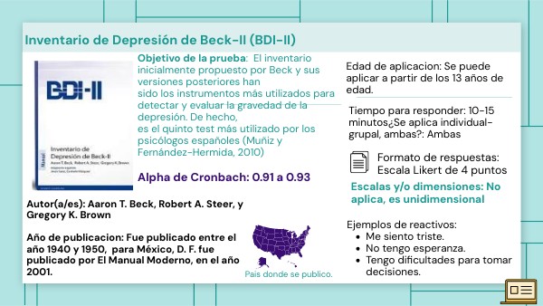 Autor(a/es): Aaron T. Beck, Robert A. Steer, y Gregory K. Brown Año de publicacion: Fue publicado entre el año 1940 y 1950, para México, D. F. fue publicado por El Manual Moderno, en el año 2001.