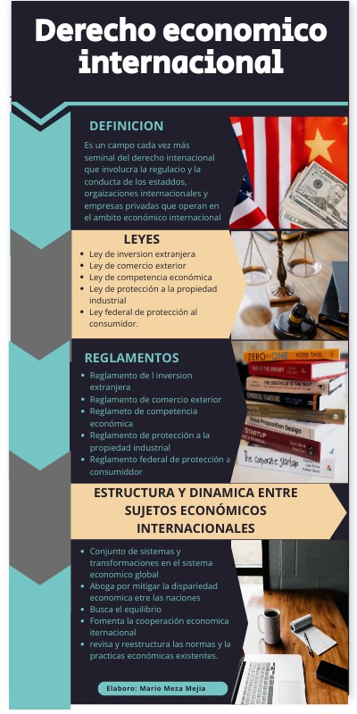 Es un campo cada vez más seminal del derecho intenacional que involucra la regulacio y la conducta de los estaddos, orgaizaciones internacionales y empresas privadas que operan en el ambito económico internacional