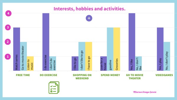 These are the activities that my classmates are usually most interested in: 1. GOING TO MOVIE THEATER. 2. DO EXERCISE 3. PLAY VIDEOGAMES Where can we going to watch a movie in Mexicali city? My recomendation...