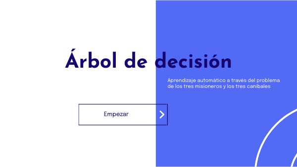 En esta presentación encontrarás un árbol de decisión para resolver el problema de los tres misioneros y los tres caníbales: Tres misioneros se han perdido en la jungla mientras paseaban a través de ella. Se encuentran muy lejos de sus compañeros, no tienen alimentos, ni forma de comunicarse con ellos. Lo bueno es que saben que para llegar a su destino deben ir siempre hacia adelante. Mientras caminaban de regreso, aparece un río que les bloquea el paso. Allí se encuentran con tres caníbales que tienen una balsa, puesto que ellos también pensaban cruzar ese obstáculo. En otras ocasiones ya se habían encontrado grupos de misioneros y caníbales, y había cierto respeto entre ellos, pero tampoco confiaban al 100% los unos en los otros, ya que cuando el número de caníbales era mayor que el de misioneros se los comían. Los caníbales se muestran amigables y quieren ayudar a los misioneros a cruzarlo, pero la balsa, hecha con troncos de palmera y lianas, es bastante precaria y solo puede llevar a dos personas a la vez. Los misioneros necesitan cruzar el río para llegar a su casa ya que pronto anochecerá y no se desenvuelven tan bien en la jungla como para permanecer la noche allí. ¿Puedes ayudarles a que crucen todos? Recuerda que nunca puede haber un mayor número de caníbales que de misioneros, ni en la orilla, ni en la balsa, ya que tendrían problemas.