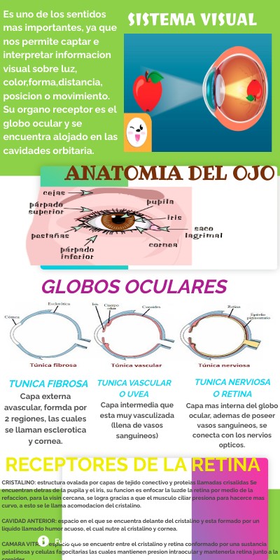 Es uno de los sentidos mas importantes, ya que nos permite captar e interpretar informacion visual sobre luz, color,forma,distancia, posicion o movimiento.Su organo receptor es el globo ocular y se encuentra alojado en las cavidades orbitaria.