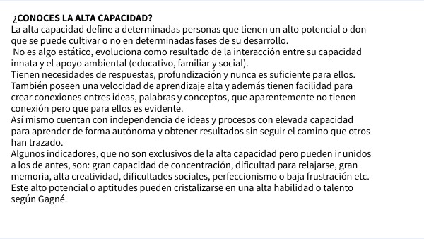 ¿CONOCES LA ALTA CAPACIDAD? La alta capacidad define a determinadas personas que tienen un alto potencial o don que se puede cultivar o no en determinadas fases de su desarrollo. No es algo estático, evoluciona como resultado de la interacción entre su capacidad innata y el apoyo ambiental (educativo, familiar y social). Tienen necesidades de respuestas, profundización y nunca es suficiente para ellos. También poseen una velocidad de aprendizaje alta y además tienen facilidad para crear conexiones entres ideas, palabras y conceptos, que aparentemente no tienen conexión pero que para ellos es evidente. Así mismo cuentan con independencia de ideas y procesos con elevada capacidad para aprender de forma autónoma y obtener resultados sin seguir el camino que otros han trazado. Algunos indicadores, que no son exclusivos de la alta capacidad pero pueden ir unidos a los de antes, son: gran capacidad de concentración, dificultad para relajarse, gran memoria, alta creatividad, dificultades sociales, perfeccionismo o baja frustración etc. Este alto potencial o aptitudes pueden cristalizarse en una alta habilidad o talento según Gagné.