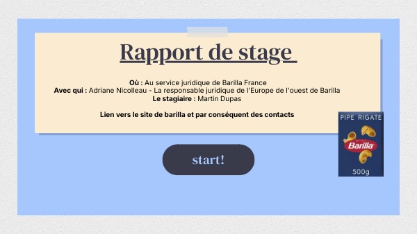 Où : Au service juridique de Barilla France Avec qui : Adriane Nicolleau - La responsable juridique de l'Europe de l'ouest de Barilla Le stagiaire : Martin Dupas Lien vers le site de barilla et par conséquent des contacts
