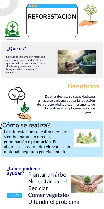 Se trata de la plantación masiva de árboles en superficies forestales que han sido deforestadas, es decir, donde antiguamente existían bosques, selvas o vegetación semiárida.