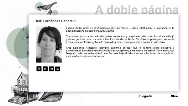 Estudió Bellas Artes en la Universidad del País Vasco , Bilbao (2001-2006) e Ilustración en la Escola Massana de Barcelona (2006-2009). Trabajó como asistente de diseño, artista conceptual y de guiones gráficos en Barcelona y dibujó guiones gráficos para una serie infantil en Irlanda del Norte. También ha participado en varias exposiciones colectivas y ha sido premiado y seleccionado en varios concursos de cómic. Crea Ediciones Armadillo «siempre quisimos enfocar que el fanzine fuera colectivo y experimental. También intentamo colaborar con gente que de normal no estaba muy visibilizada. Después cada una se ha editado sus fanzines bajo el sello y vamos a festivales de autoedición para vender todo lo que sacamos»