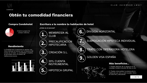 Tu propia habitación de hotel escriturada a tu nombre. Obtienes rentabilidad durante todo el año y de por vida con muchas ventajas para ti.¿Cómo lo hacemos? Localizamos oportunidades de hoteles que se encuentran en lugares estratégicos de alta ocupación turística en el mundo. Analizamos el rendimiento anual con la información que obtenemos del entorno y, cuando se puede, de los propietarios, tomando en cuenta que sus números son altos puesto que quieren vender. Después de nuestro análisis consideramos ciertos aspectos que se pueden mejorar: de administración, modificación o aumento de estrellas, etc. Con esto, lanzamos a nuestros socios la oferta para invertir, como inversores preferentes. A partir de ahí, si no llegamos a cerrar el grupo, lo comercializamos a nivel mundial.