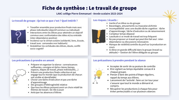 - Prévoir une production finale collective et qui engage tout le monde (que la production de chacun soit visible et identifiable)