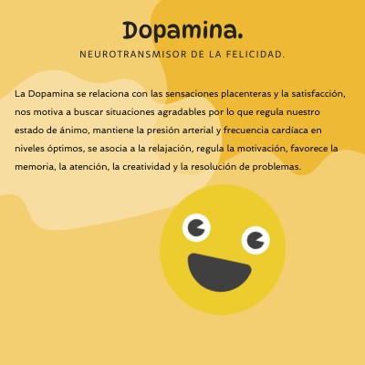La Dopamina se relaciona con las sensaciones placenteras y la satisfacción, nos motiva a buscar situaciones agradables por lo que regula nuestro estado de ánimo, mantiene la presión arterial y frecuencia cardíaca en niveles óptimos, se asocia a la relajación, regula la motivación, favorece la memoria, la atención, la creatividad y la resolución de problemas.