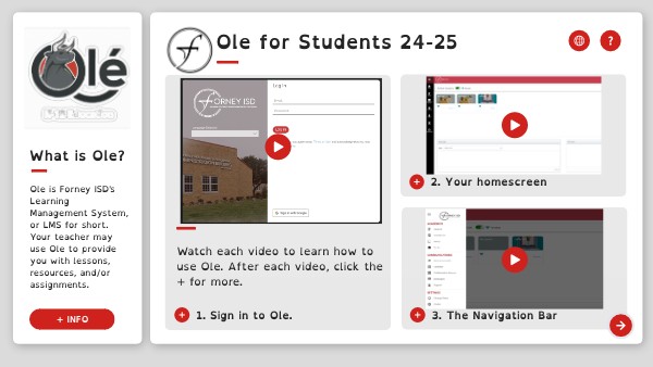 Ole is Forney ISD's Learning Management System, or LMS for short. Your teacher may use Ole to provide you with lessons, resources, and/or assignments.