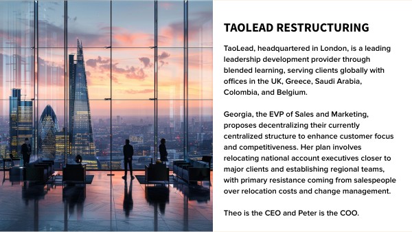 TaoLead, headquartered in London, is a leading leadership development provider through blended learning, serving clients globally with offices in the UK, Greece, Saudi Arabia, Colombia, and Belgium. Georgia, the EVP of Sales and Marketing, proposes decentralizing their currently centralized structure to enhance customer focus and competitiveness. Her plan involves relocating national account executives closer to major clients and establishing regional teams, with primary resistance coming from salespeople over relocation costs and change management. Theo is the CEO and Peter is the COO.