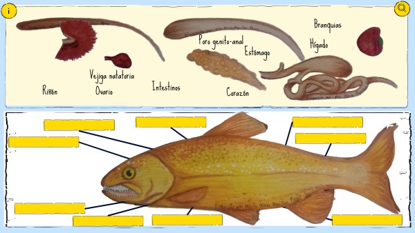 INSTRUCCIONES: Arrastra cada estructura del pescado y su nombre al lugar correcto, según la información que aparece en los recuadros amarillos cuando colocas el puntero encima.