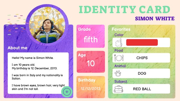 Hello! My name is Simon White. I am 10 years old. My birthday is 12 December, 2013. I was born in Italy and my nationality is Italian. I have brown eyes, brown hair, very light skin and I'm not tall.