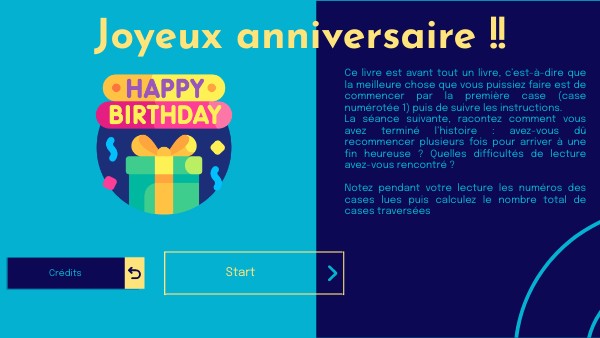 Ce livre est avant tout un livre, c’est-à-dire que la meilleure chose que vous puissiez faire est de commencer par la première case (case numérotée 1) puis de suivre les instructions. La séance suivante, racontez comment vous avez terminé l’histoire : avez-vous dû recommencer plusieurs fois pour arriver à une fin heureuse ? Quelles difficultés de lecture avez-vous rencontré ? Notez pendant votre lecture les numéros des cases lues puis calculez le nombre total de cases traversées