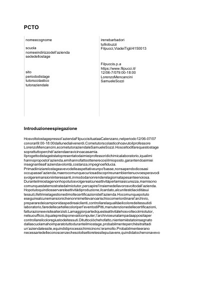 Hosvoltolostagepressol’aziendaFilpuccisituataaCalenzano,nelperiodo12/06-07/07conorari9:00-18:00dallunedialvenerdi.CometutorscolasticohoavutoilprofessoreLorenzoMencancini,ecometutoraziendaleSamueleSozzi.Hosceltodifarequestostagesoprattuttoperchél’aziendaeravicinoacasamia.Ilprogettodistageèstatopresentatodaimieiprofessoridichimicalaboratorio,iqualimihannopropostol’azienda,emihannofattoottenerecosìilmioposto,garantendoaimieiinsegnantieall’aziendavolontà,costanza,impegnoefiducia.Primadiiniziarelostageavevodelleaspettativeunpo'basse,nonsapendodicosasioccupassel’azienda,maerocomunquecuriosadiscoprireunambientenuovoesperavodisvolgeremansioniinteressanti,inmododanonrenderelagiornatapesanteenoiosa.Duranteilmiostagenonhopotutosvolgerealcuneattivitàperlamiasicurezza,mamisonocomunquestatemostratedalmiotutor,percapirel’insiemedellavorosvoltodall’azienda.Hopotutoquindiosservareleattivitàdiproduzione,ilcardato,alcunitestdiaciditàsuitessuti,ifeltrinielagestionedimoltecertificazionidell'azienda.Hocomunquepotutoeseguirealcunemansionichenonmimettevanoarischiocomeriordinarel’archivio,prepararedeicampionidaspedireaiclienti,controllarelaqualitàeilcoloredeitessutidilaboratorio,faredellecartellecoloriperl’eventodiPitti,manutenzionedellecertificazioni,fatturazioneevisiteaiterzisti.Lamaggiorpartediquesteattivitàlehosvoltecolmiotutor,nelsuoufficio,ilqualepredisponevailcomputer,l’archivioeunalampadaappositapercontrollareilcoloregiustodeitessuti.Dituttociòchehofatto,nientemièstatoinsegnatodallascuolamahoimparatotuttoduranteilmiostage,probabilmenteperchésitrattadiun’aziendatessile,equindidiprocessichimicinonc’eramolto.Probabilmenteeranonecessariedelleconoscenzechesoloilsettoretessilepuòavere,quindidatochenonavevo
