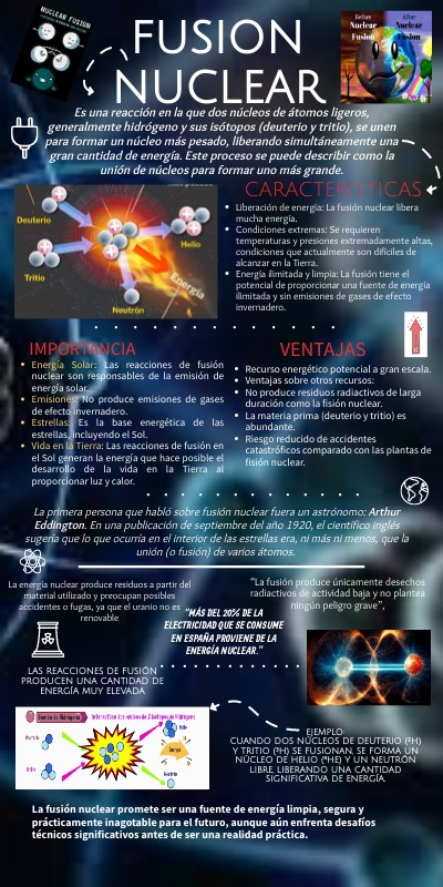 Es una reacción en la que dos núcleos de átomos ligeros, generalmente hidrógeno y sus isótopos (deuterio y tritio), se unen para formar un núcleo más pesado, liberando simultáneamente una gran cantidad de energía. Este proceso se puede describir como la unión de núcleos para formar uno más grande.