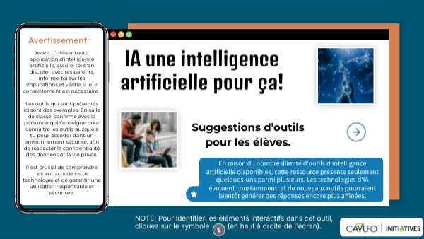 Avant d'utiliser toute application d'intelligence artificielle, assure-toi d'en discuter avec tes parents, informe-toi sur les implications et vérifie si leur consentement est nécessaire. Les outils qui sont présentés ici sont des exemples. En salle de classe, confirme avec la personne qui t’enseigne pour connaître les outils auxquels tu peux accéder dans un environnement sécurisé, afin de respecter la confidentialité des données et la vie privée. Il est crucial de comprendre les impacts de cette technologie et de garantir une utilisation responsable et sécurisée.