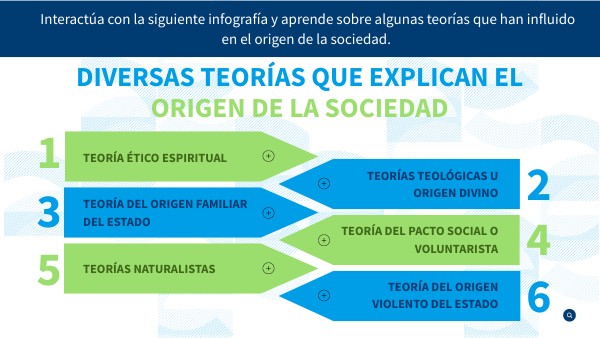 Interactúa con la siguiente infografía y aprende sobre algunas teorías que han influido en el origen de la sociedad.