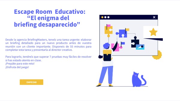 Desde la agencia BriefingMasters, teneís una tarea urgente: elaborar un briefing detallado para un nuevo producto antes de vuestra reunión con un cliente importante. Disponeis de 55 minutos para completar esta tarea y presentarla al director creativo. Para lograrlo, tendreís que superar 7 pruebas muy fáciles de resolver si has estado atento en clase. ¡Prepáte para este reto! ¡Disfruta del juego!