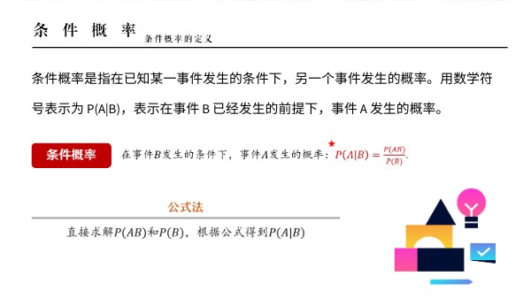 条件概率是指在已知某一事件发生的条件下,另一个事件发生的概率。用数学符号表示为 P(A|B),表示在事件 B 已经发生的前提下,事件 A 发生的概率。