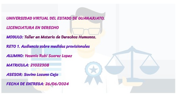 UNIVERSIDAD VIRTUAL DEL ESTADO DE GUANAJUATO. LICENCIATURA EN DERECHO MODULO: Taller en Materia de Derechos Humanos. RETO 1. Audiencia sobre medidas provisionales ALUMNO: Yesenia Rubi Suarez Lopez MATRICULA: 21022308 ASESOR: Savino Lozano Ceja FECHA DE ENTREGA: 26/06/2024