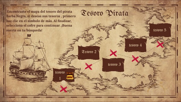 .Encontraste el mapa del tesoro del pirata Barba Negra, si deseas sus tesoros , primero haz clic en el símbolo de más. Al finalizar, selecciona el cofre para continuar. ¡Buena suerte en tu búsqueda!