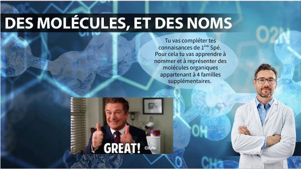 Tu vas compléter tes connaisances de 1ère Spé. Pour cela tu vas apprendre à nommer et à représenter des molécules organiques appartenant à 4 familles supplémentaires.