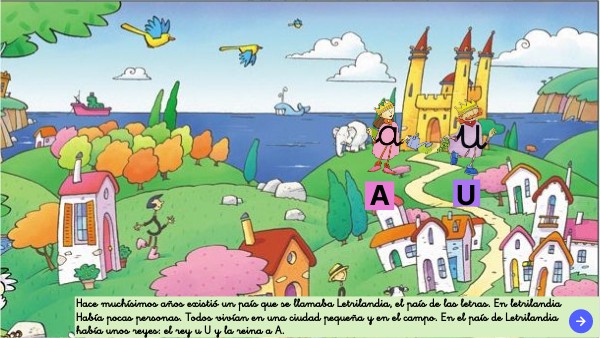 Hace muchísimos años existió un país que se llamaba Letrilandia, el país de las letras. En letrilandia Había pocas personas. Todos vivían en una ciudad pequeña y en el campo. En el país de Letrilandia había unos reyes: el rey u U y la reina a A.