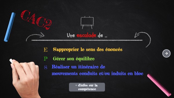 Réaliser un certain nombre de déplacements selon un itinéraire articulant des lignes d'actions amenant l'élève à :- Associer des actions de traction et de poussée et se placer en lien avec les orientations de prises mains et leur association avec les prises pieds.