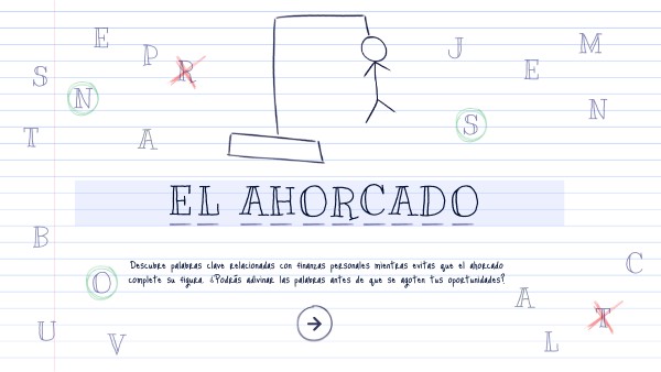 Descubre palabras clave relacionadas con finanzas personales mientras evitas que el ahorcado complete su figura. ¿Podrás adivinar las palabras antes de que se agoten tus oportunidades?