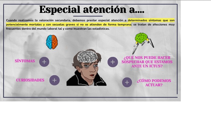 Ante los síntomas anteriormente descritos podemos sospechar de un ICTUS, que se trata de una enfermedad cerebrovascular que produce una alteración de la circulación cerebral, bien por un trombo, o bien por una hemorragia, que compromete el riego normal de sangre a determinadas estructuras cerebrales, a las que deja de llegar el aporte de oxígeno necesario, por lo que las células nerviosas de ese área del cerebro no pueden funcionar bien y mueren transcurridos unos minutos.