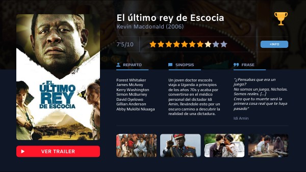 Un joven doctor escocés viaja a Uganda a principios de los años 70s y acaba por convertirse en el médico personal del dictador Idi Amin, llevándole esto por un oscuro camino a descubrir la realidad de una dictadura.