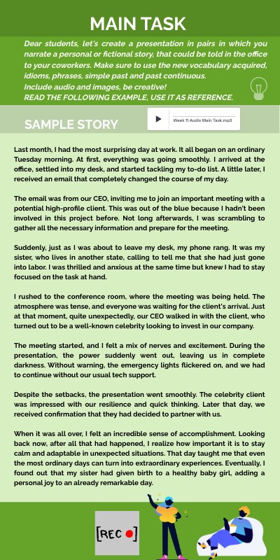 Dear students, let's create a presentation in pairs in which you narrate a personal or fictional story, that could be told in the office to your coworkers. Make sure to use the new vocabulary acquired, idioms, phrases, simple past and past continuous.Include audio and images, be creative!READ THE FOLLOWING EXAMPLE, USE IT AS REFERENCE.