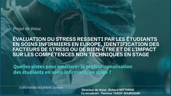 Comparer le stress des étudiants infirmiers en France avec les étudiants européens (Belgique, Espagne) avec des questionnaires Identifier les causes de ce stress (ou les facteurs de bien-être) qui pourraient permettre d’améliorer les apprentissages et notamment les compétences dites non techniques en stage avec des entretiens d'explicitation