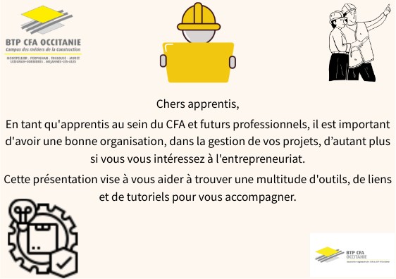 Chers apprentis, En tant qu'apprentis au sein du CFA et futurs professionnels, il est important d'avoir une bonne organisation, dans la gestion de vos projets, d’autant plus si vous vous intéressez à l'entrepreneuriat. Cette présentation vise à vous aider à trouver une multitude d'outils, de liens et de tutoriels pour vous accompagner.